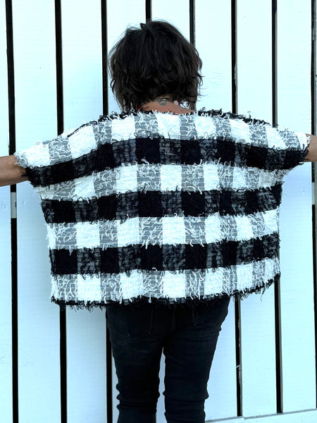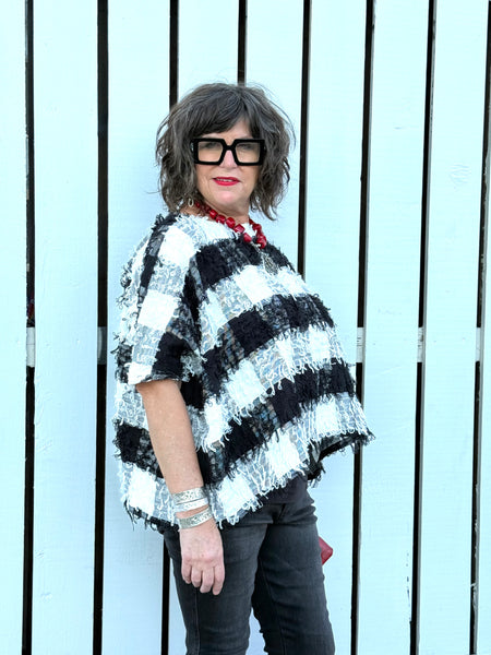 The roomy poncho-style silhouette drapes beautifully on all body types, creating an effortless, modern shape that pairs perfectly with denim, wide-leg pants, or a sleek black bottom. Lightweight yet structured, this top transitions seamlessly from daytime outings to evening events, making it an essential for women seeking unique boutique tops, black-and-white statement tops, or artsy textured tops that stand out.