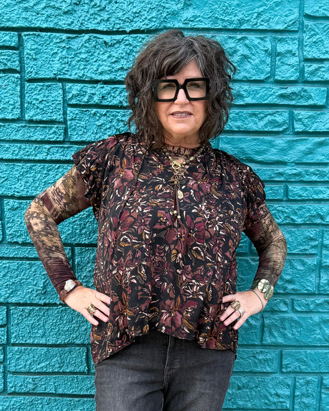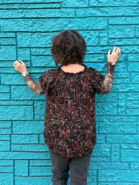 This artfully layered blouse brings depth and movement to an everyday silhouette. The short sleeved sheer floral overlay features rich, moody tones of plum, espresso, and soft gold set against a dark background. Subtle ruffle detailing at the shoulders and a gently gathered back neckline give this top an easy drape that feels relaxed yet intentional.