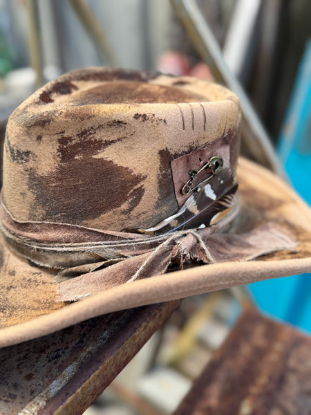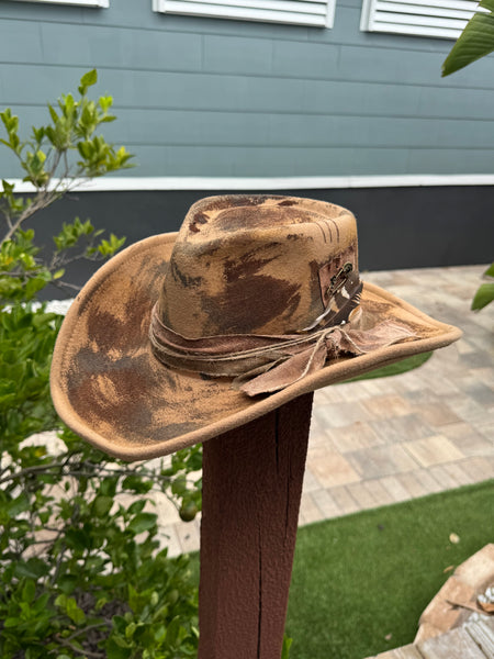 Handmade. One of a kind. Adjustable band. Wired brim so you can bend the edge to create the look you want. This piece is fabulous. Looks cute on everyone.