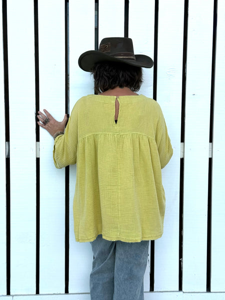 The airy cotton fabric has a subtle crinkle texture, making this top ideal for warm days, layering seasons, and everyday styling. Easy to throw on, easy to love — this piece pairs naturally with denim, linen pants, or relaxed trousers.