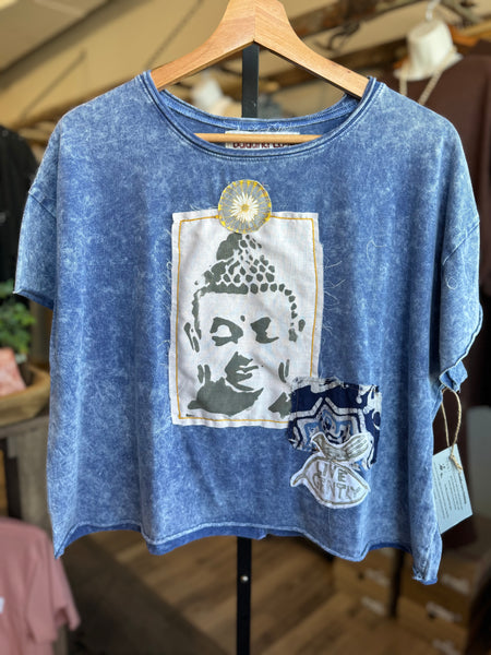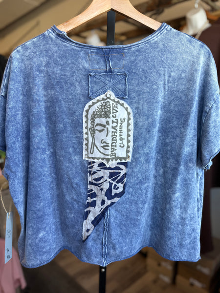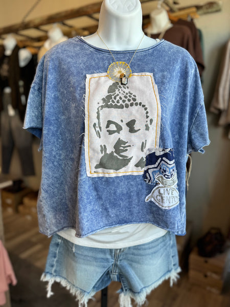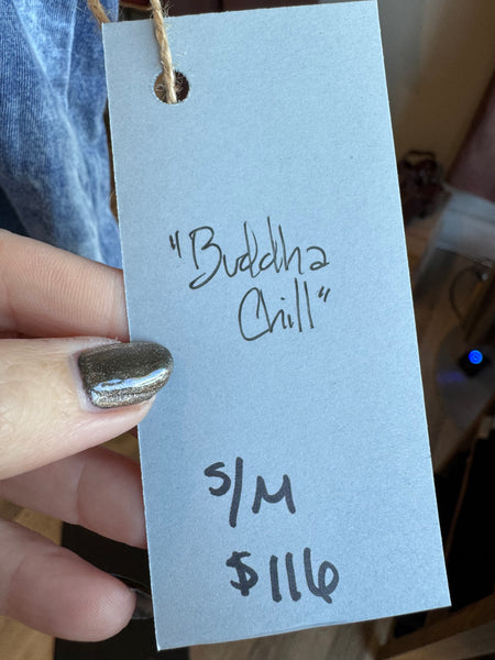 “Buddha Chill” tee is a blue washed color. Oversized boxy fit. This piece is S/M. Recommended for sizes 0-8.