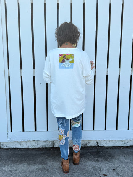 This crowd favorite won’t last long! Elevate your casual style with the soulful Buddha Love Sweatshirt. Upcycled from a soft, white cotton, this relaxed-fit sweatshirt features unique raw-edge appliqué details: a purple Frida Kahlo motif, a delicate floral accent, and an inspired eye symbol and a Live Gently hand sewn patch on the reverse. The oversized cut, drop shoulders, and ribbed details at the neckline and cuffs give it a laid-back, lived-in vibe—perfect for layering with leggings, jeans, or skirts. A wearable piece of artistry that carries a sense of peace and individuality.