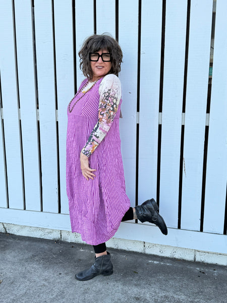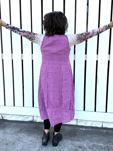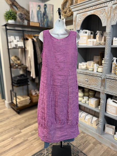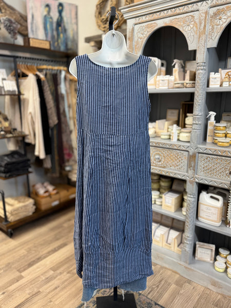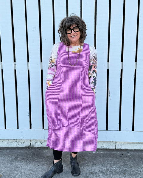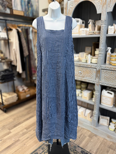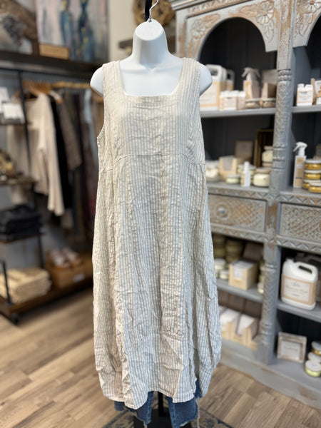 the Essential Stripe Linen Dress is the definition of easy, artful dressing. Made from lightweight, breathable linen, this piece features a relaxed A-line silhouette with a softly structured bodice and gentle flare through the hem. The vertical stripe pattern elongates the body while adding timeless visual interest — a go-to for women who love boho layering dresses, lagenlook style, and effortless everyday comfort.
