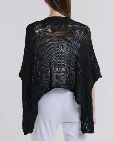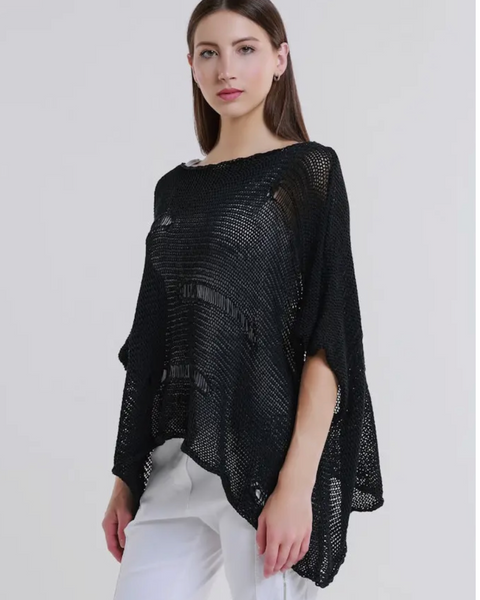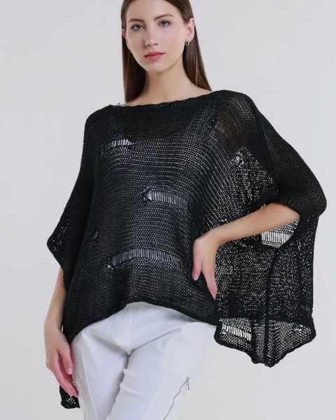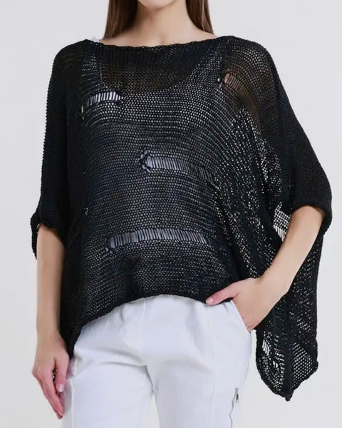 Introducing Jean: we are going to call her “holy”….. a must-have piece for your wardrobe! This stylish open knit sweater combines fashion and functionality, featuring a flattering elbow sleeve design and a slightly distressed pattern that exudes a fashionable ease. Perfect for layering over a tank or long sleeve top, this versatile top effortlessly transitions from season to season. Made in Italy