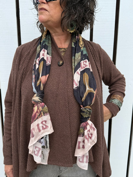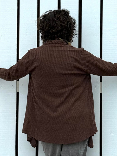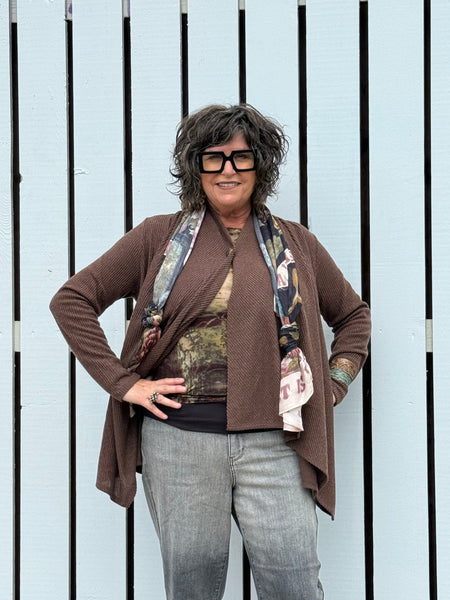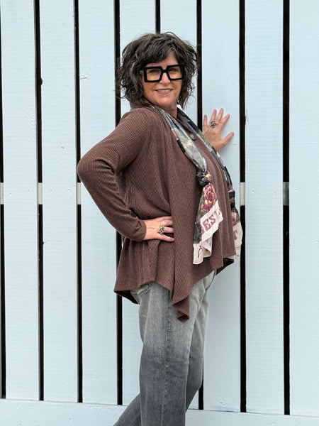 Soft sophistication meets effortless comfort in the Dear Scarlett Luxe Knit Swing Cardigan. Crafted from a lightweight ribbed knit with subtle texture, this open-front cardigan-style top features a graceful draped silhouette and a single statement button closure at the neckline for a polished touch. The handkerchief hem adds movement and flow, making it the perfect piece to layer over tees, tanks, or dresses. Its warm mocha tone brings a modern neutral that pairs beautifully with denim, black, or earth tones. A timeless blend of comfort, texture, and boho-luxe elegance, this top transitions seamlessly from casual days to cozy evenings.