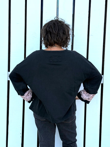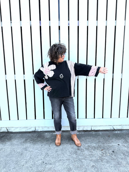 Artful and effortlessly cool, the Patchwork Petals Boho Top blends creativity with comfort for a standout look. This oversized black cotton top features mixed fabric panels and a bold appliqué floral design in soft pink blush and cream tones. With its relaxed fit, dropped shoulders, and wide sleeves, it’s a statement piece that feels as easy as your favorite tee. Perfect for layering over jeans or pairing with casual pants, this artisan-inspired patchwork top adds a touch of free-spirited charm to your everyday wardrobe. Each piece has a one-of-a-kind feel, making it a must-have for those who love unique, expressive fashion.