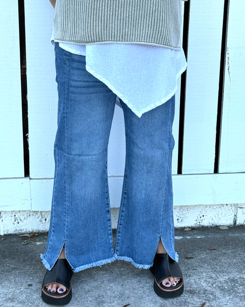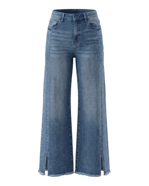 The wide-leg shape falls straight and long for that effortless, tailored feel. A subtle vertical seam detail enhances the lengthening effect, while the raw frayed hem and small slit accent add just enough edge to keep it modern.