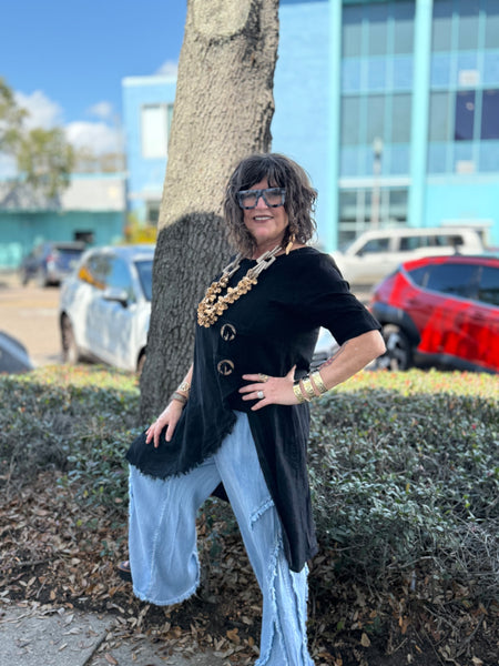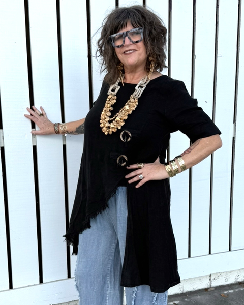 Oversized side toggles add artisan character and subtle structure, while the relaxed silhouette drapes beautifully over the body without clinging. The longer back hem offers graceful coverage, making it ideal for pairing with wide-leg pants, palazzo styles, or layered over a fitted tank for dimension.