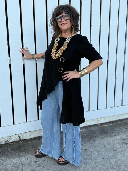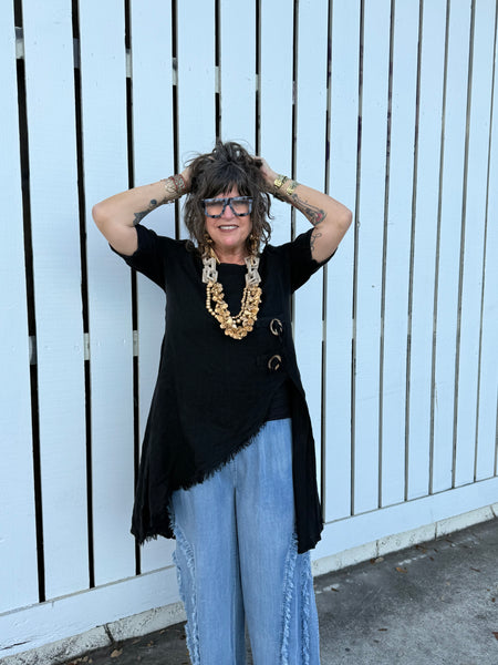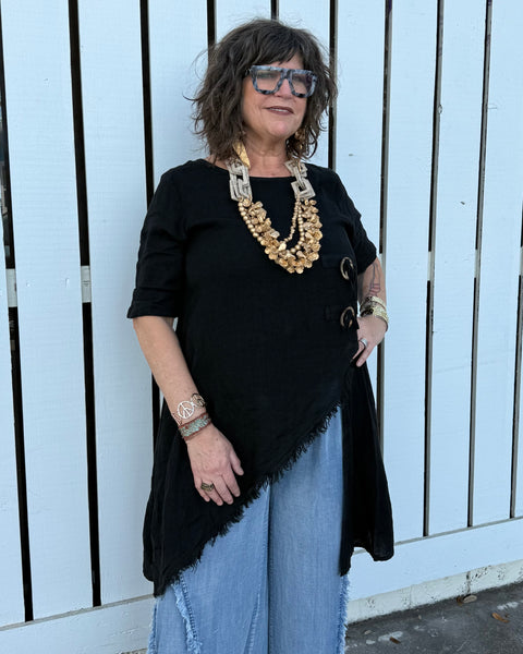 The Noir Asymmetrical Top is a modern statement piece designed for women who dress with intention. Crafted in breathable, lightweight linen, this fashion-forward black tunic features a dramatic angled hem with raw-edge fringe detailing that creates movement and architectural edge.