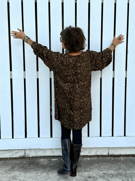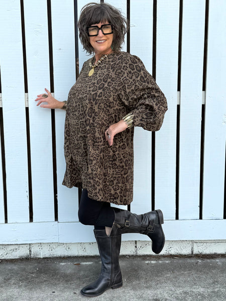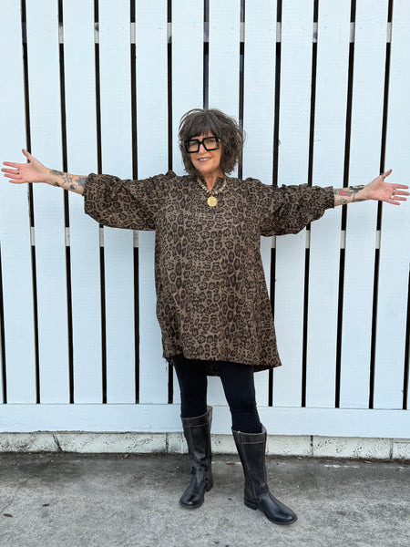 Unleash your inner wild with this chic leopard print tunic dress. Featuring a relaxed silhouette, subtle balloon sleeves, and handy side pockets, it’s the perfect blend of bold and effortless in the softest, lightest corduroy ever. Wear it solo with boots for a fierce statement or layer over leggings for cozy, everyday edge.