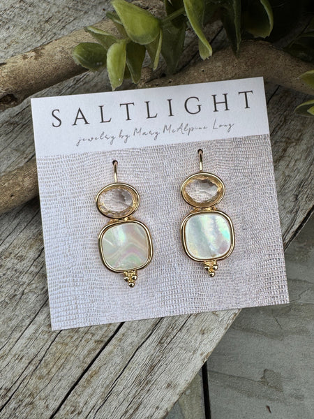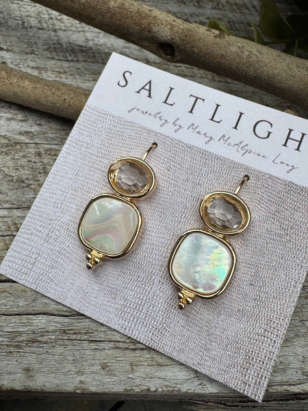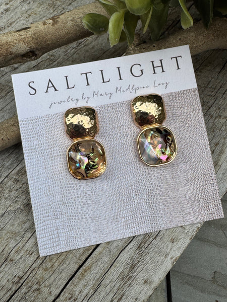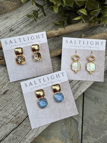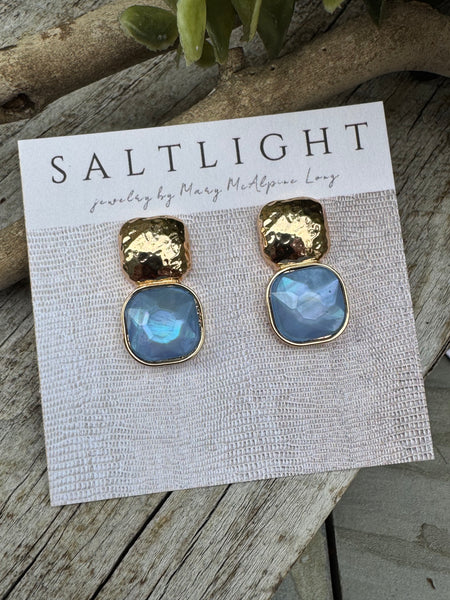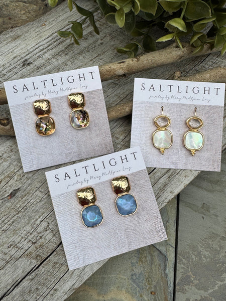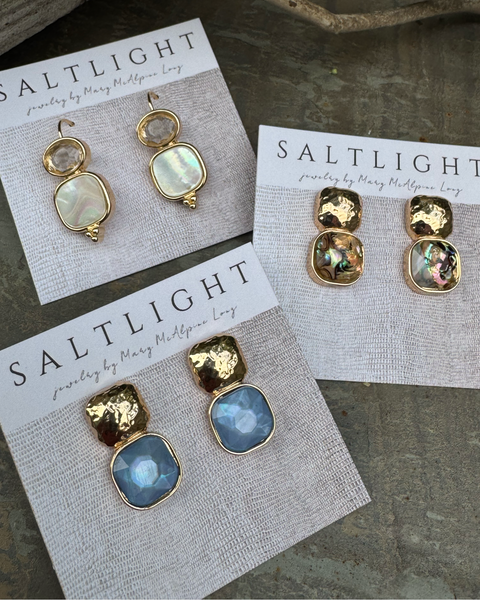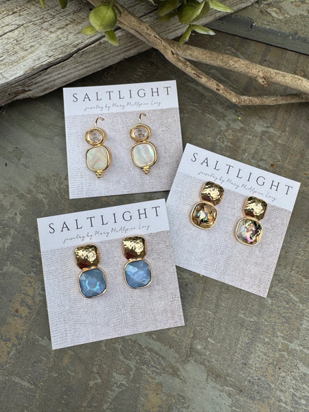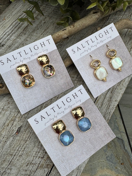 Choose from dangle mother of pearl and crystal, abalone posts, or blue bling post. All of these are hypoallergenic and lightweight.