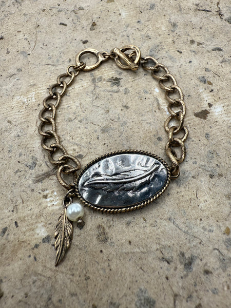 The bold oval medallion etched with a feather gives it a grounded, earthy elegance, while the dangling feather charm, pearl bead, and crystal accent add movement and a touch of softness. The chunky chain and adjustable toggle clasp keep it edgy and substantial—perfect for pairing with other boho-metallic layers or wearing solo as a statement.