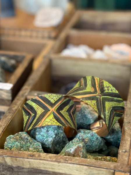Make a striking statement with the Jungle Vibe Cuff, where raw copper meets vibrant hand-painted design. The bold chevron pattern in vivid lime green, earthy bronze, and deep black creates a dynamic, textured look that feels both tribal and modern. Each cuff is uniquely detailed, embodying artistry, edge, and a fearless pop of color—perfect for stacking or wearing solo as your standout piece. Adjustable fit.