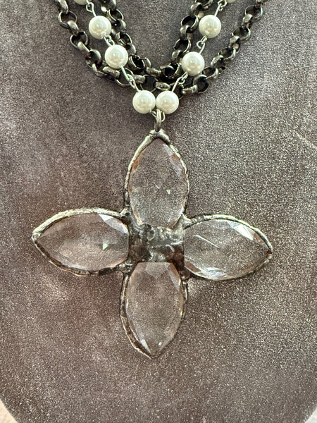 A striking blend of softness and strength, the Pearl Crossroads Necklace layers luminous faux pearls with oxidized gunmetal chain for a look that feels both timeless and unexpected. The focal point is a dramatic cross-shaped pendant formed from faceted clear crystal stones, each individually set to catch the light from every angle. The contrast between the refined pearls, industrial chain, and raw-edged crystal gives this piece its unmistakable presence.