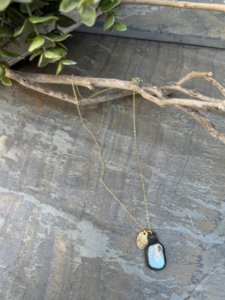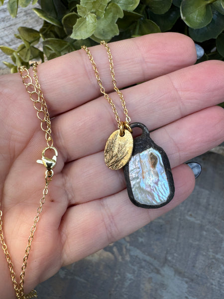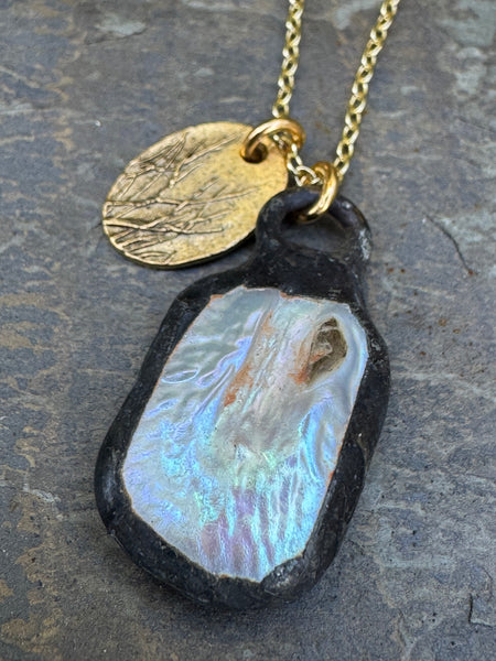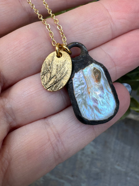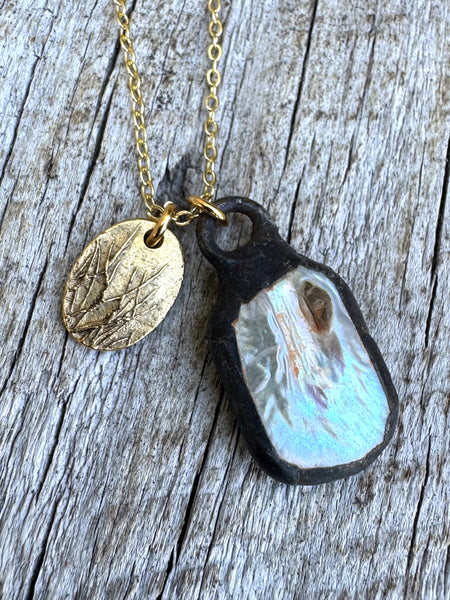 Dainty gold filled necklace, 16” length with 2 1/3” extender.  Pendants and soldered patina genuine baroque pearl and a small plant pressed bronze charm.  This is a unique, one of a kind piece.  Stunning.  Perfect to wear on its own or stacked with some of your favorite necklaces.