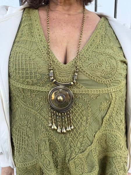 Bold, soulful, and effortlessly striking, the Nomad Medallion Necklace is a statement piece that feels collected rather than curated. A substantial antiqued gold-tone chain leads to a round medallion pendant with layered concentric detailing and a softly domed center. Finished with a fringe of sculptural drop elements, this necklace moves beautifully and adds instant character to even the simplest look.