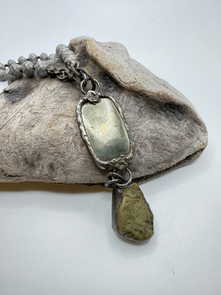 The Twin Relic Drop Necklace features a bold double-stone pendant with earthy metallic sheen and organic texture, framed in dark solder for a raw, ancient feel. Suspended from a strand of faceted silvery beads, the two stones create a powerful vertical silhouette—grounded yet luminous, rugged yet refined. A statement piece that feels like it was unearthed from history, this necklace is perfect for layering or standing alone as a striking focal point.