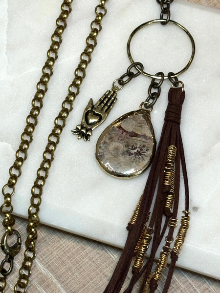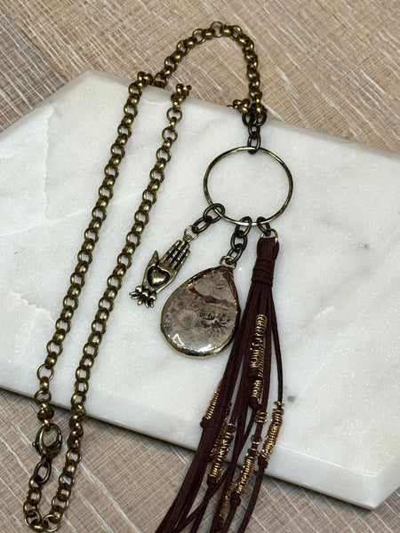 30” chain with lobster clasp. Leather tassel. Jasper pendant. Hand charm.