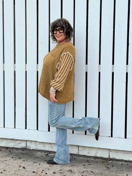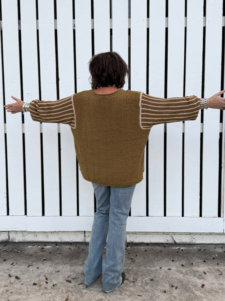 Wrap yourself in effortless comfort with our Harvest Stripe Cozy Pullover Sweater, a chic blend of texture, warmth, and modern boho style. This easygoing knit features a beautifully textured body in a rich golden-wheat hue paired with striped balloon sleeves that add soft structure and standout detail. The relaxed silhouette drapes comfortably without clinging, making it the perfect everyday sweater for layering with jeans, wide-legs, or skirted looks.