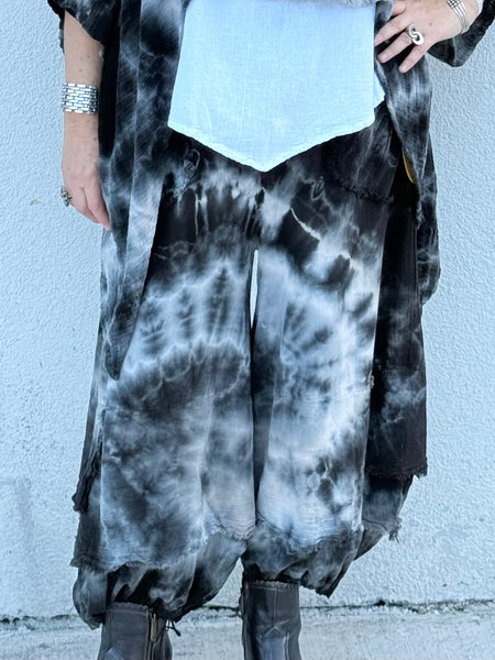 A fun, daring cotton gauze pant. For women that like a little edge in their wardrobe. full leg with elastic at the ankle. A flared flap that makes it look a little like a harem pant, and has pockets.