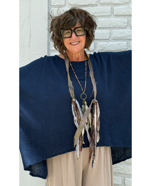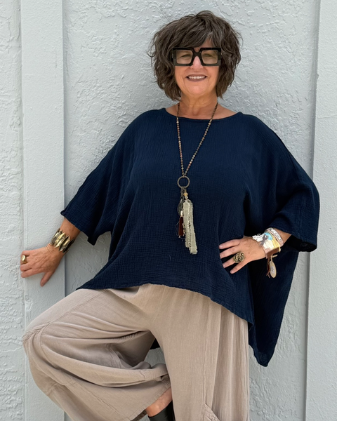 Turn up the volume on your everyday style with this tunic top – a bold and breezy statement piece from Oh My Gauze®, crafted from 100% breathable crinkle cotton. This oversized boho tunic top in offers flowy comfort with dramatic drape and effortless flair. With its wide-cut sleeves, flattering high-low hemline, and scoop neckline, this one-size-fits-most top flatters all body shapes while adding a splash of vibrant energy to any outfit.