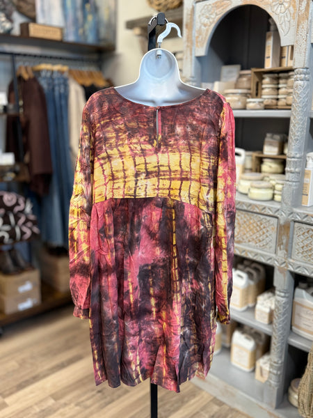 A scoop neckline, long sleeves, and subtle pleating create an easy, feminine shape — ideal for women searching for boho babydoll dresses, tie-dye casual dresses, weekend-ready tunics, and fall layering pieces. Pair it with leggings and boots for a cozy seasonal look or keep it breezy with sandals for warm-weather wear.