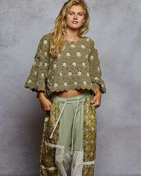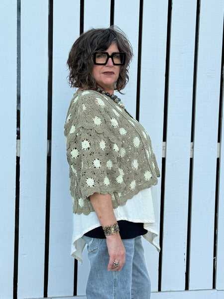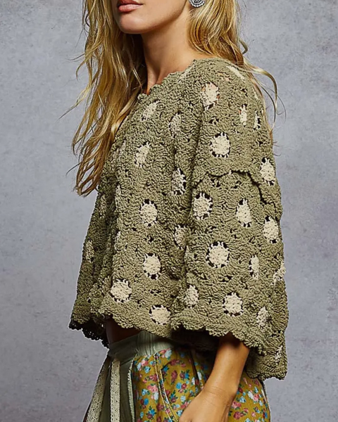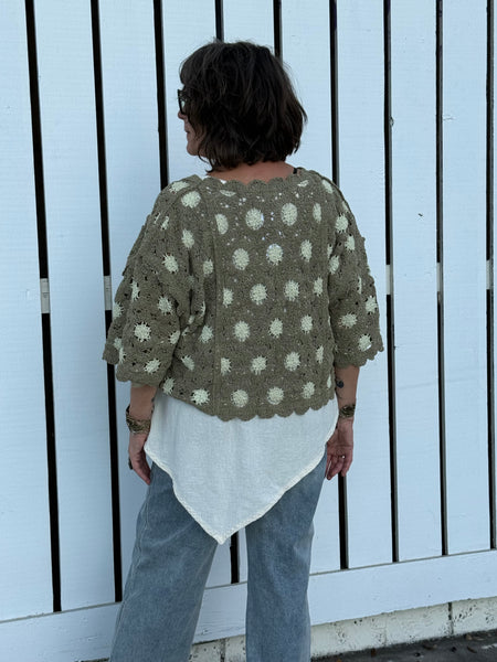 This beautifully layered top brings together soft structure and artisanal texture in an effortlessly flattering silhouette. The cropped crochet overlay features raised dot detailing and scalloped edges, creating visual interest without feeling heavy.