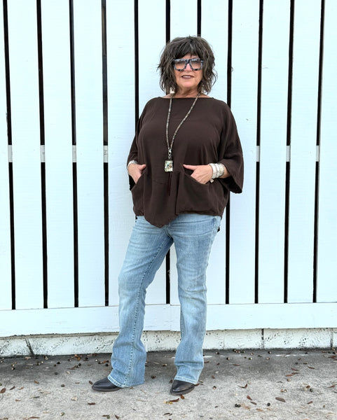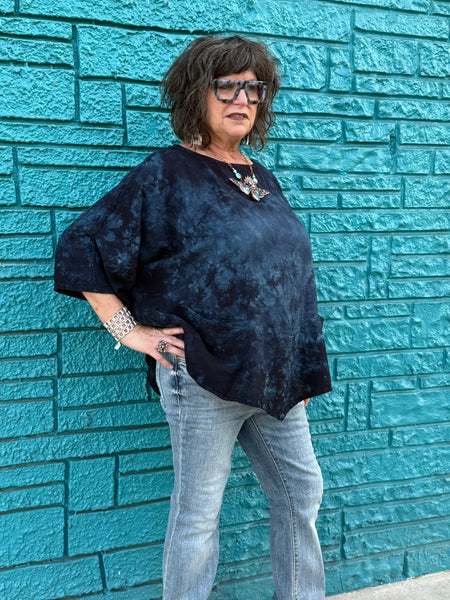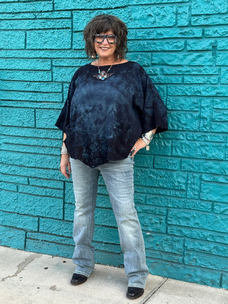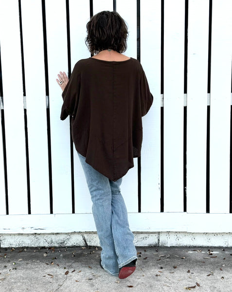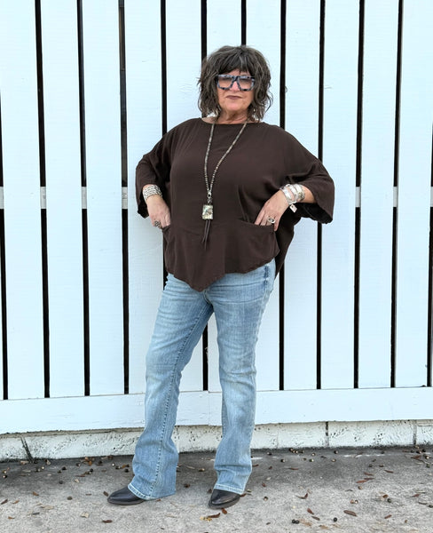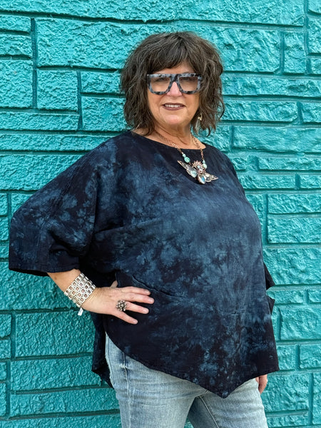 This relaxed, flowy silhouette drapes beautifully on every body, featuring wide sleeves, an asymmetrical handkerchief-style hem, and roomy front pockets for that effortless, artsy vibe Oh My Gauze is known for.