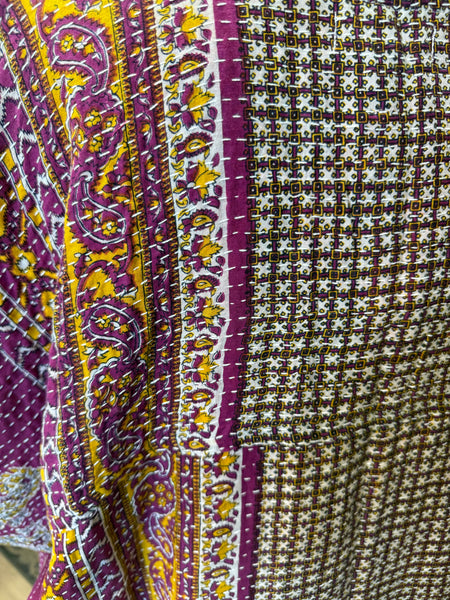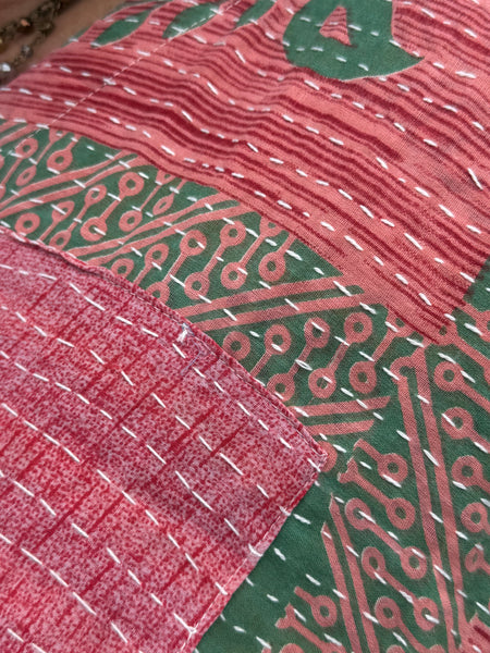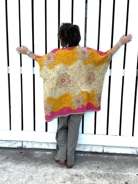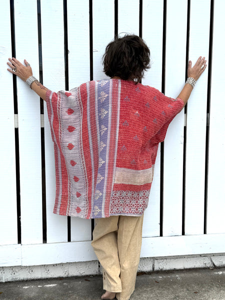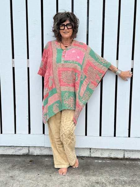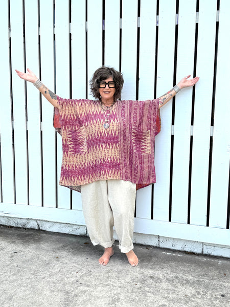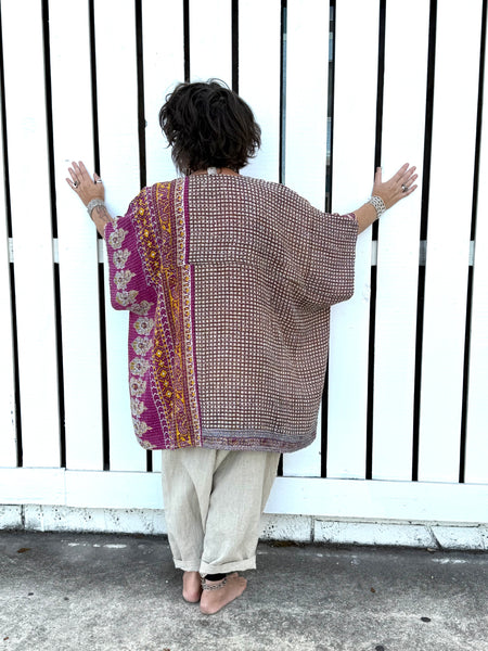 A modern muse with a soul of tradition — the Mini Muu Top by Kantha Bae is where artistry meets ease. Each piece is handcrafted from layers of repurposed vintage saris, stitched together using traditional Kantha embroidery that celebrates heritage and sustainability. The easy, oversized silhouette flows beautifully on every body, with a relaxed neckline and freeform sleeves that invite movement and comfort.