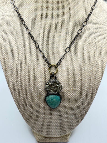 Raw and radiant, the Amazonite Alchemy Necklace pairs the glittering metallic texture of natural pyrite with the serene green-blue hues of polished amazonite. Suspended from a bold mixed-metal chain with a rustic hammered brass ring, the pendant strikes a balance between earthy grounding and luminous energy. With its organic textures and alchemical vibe, this one-of-a-kind necklace feels both ancient and modern—a talisman for strength, clarity, and transformation. Lobster claw closure.